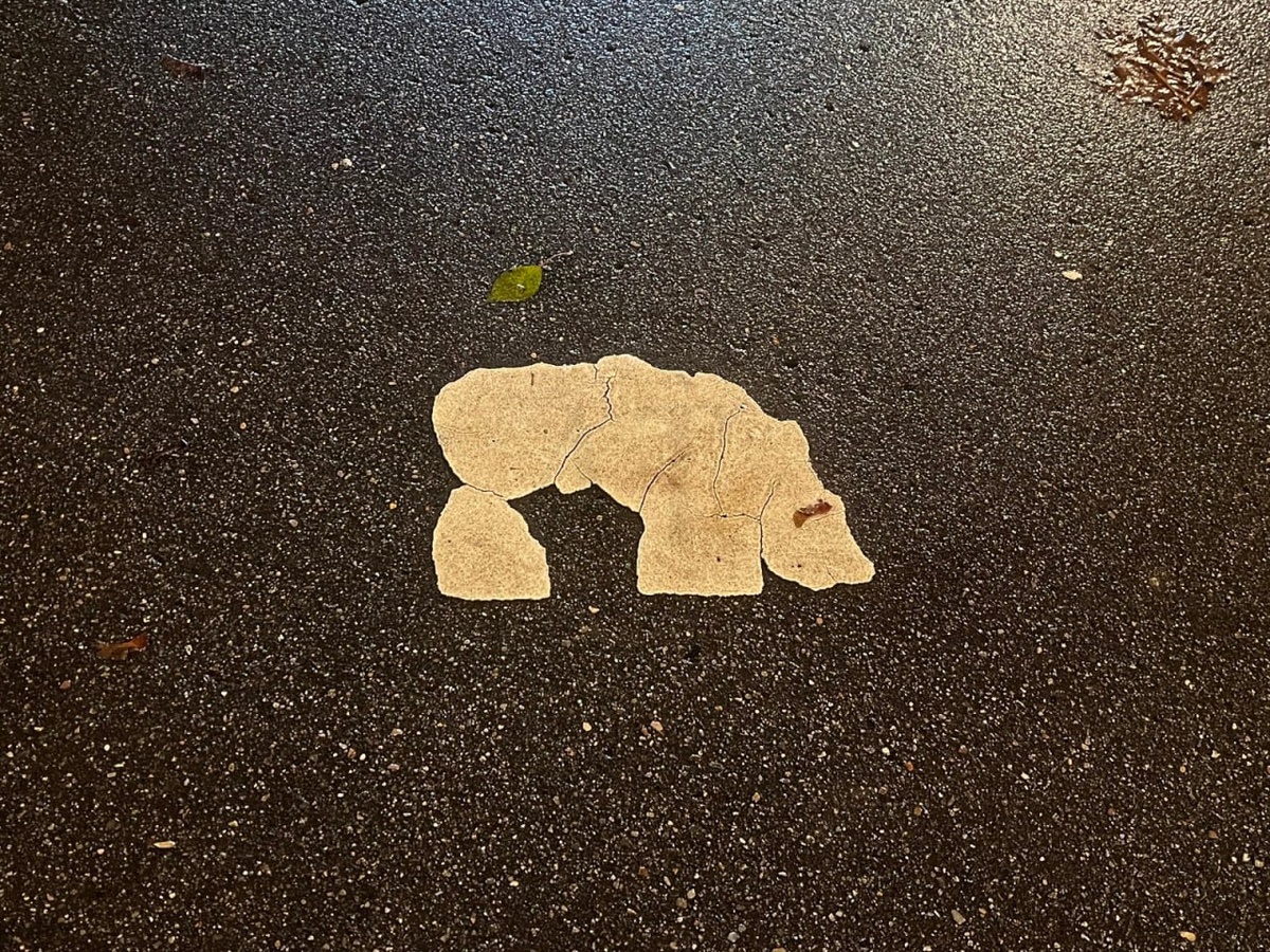 Нанесенная разметочная краска на асфальте возле кинотеатра "Спутник" частично отвалилась, а что не отвалилось, то само или по чьей-то воле стало фигурой, напоминающей белого мишку.