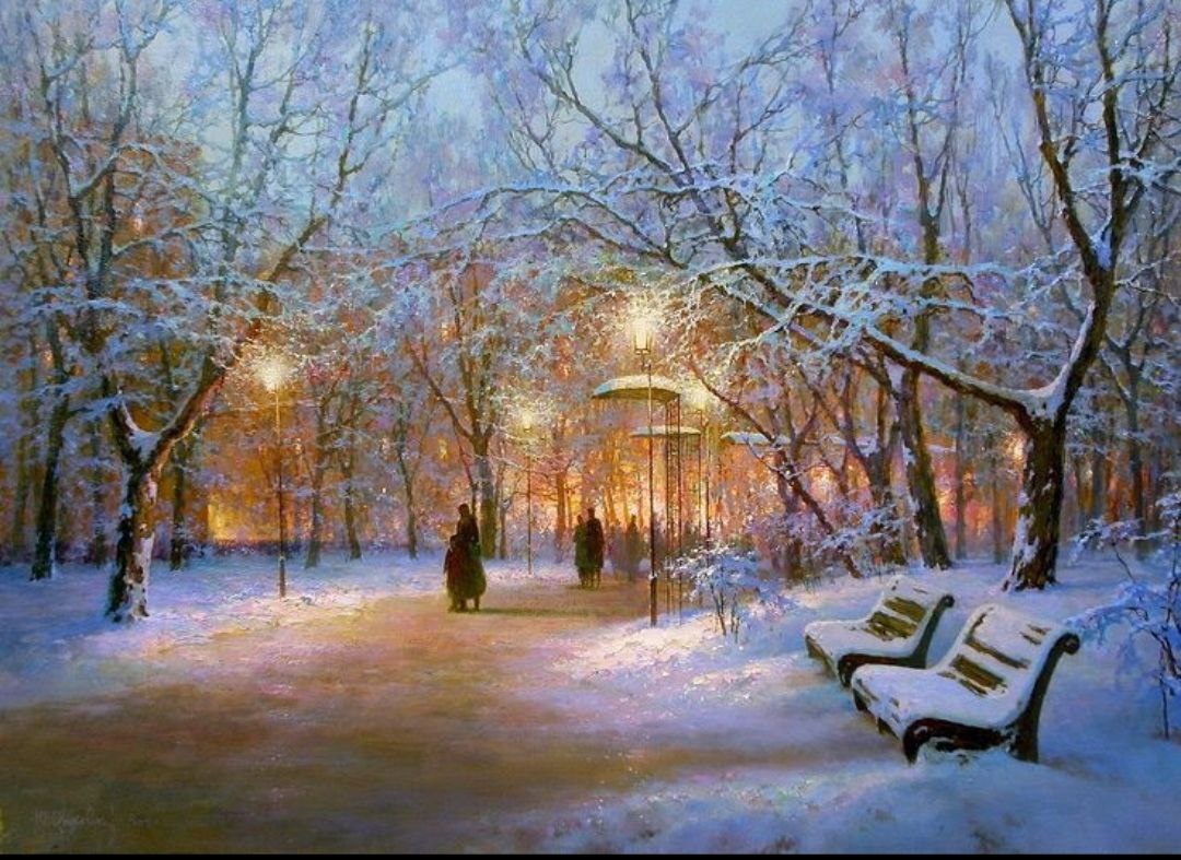 #поэтическоеутро Зимний романс В моем саду справляет новоселье Средь голых яблонь снежная зима. И в том, что нет здесь прежнего веселья Я виновата, может быть, сама. Ах, не тверди с горячностью упорной О том, что ждёт нас радость и покой, Когда молчу и рисовые зерна Роняю на пол дрогнувшей рукой. Опять зима покроет белой шалью На долгий срок мой садик и жильё, Но не тебе владеть моей печалью И не тебе разгадывать её... Лилия Юсупова Картина Юрия Обуховского "Зимние сумерки" (источник) #литературагорногоалтая
