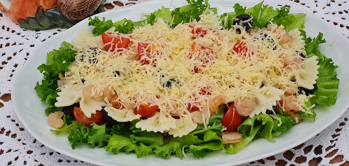 Близится Новый год. Как и многие, я люблю заранее продумывать меню и покупать продукты, и вот недавно мы с семьей попробовали салат, рецептом которого мне хотелось бы с вами поделиться. Среди остального обилия салатов «Неаполитанский» точно достоин праздничного стола. В рецепте я решила поэкспериментировать и добавить сладкий чили, и блюдо стало еще вкуснее! Попробуйте и убедитесь сами. Для 2-3 порций салата вам понадобятся: — листья салата — 1 пучок, — помидоры черри — 10 штук, — маслины — 13 штук, — паста фарфалле (макароны в виде «бабочек») — 22 штуки, — сыр твердый или полутвердый, например, «Пармезан» или «Голландский» — 30 граммов, — креветки варено-мороженные или сырые — 130-150 граммов, — масло оливковое — 3-4 столовые ложки, — соус «сладкий чили» — по вкусу. Сначала разморозьте креветки в естественных условиях — достаньте из морозилки и оставьте или при комнатной температуре, или в холодильнике. Отварите фарфалле в слегка подсоленной воде и разложите, чтобы остыли. Тщательно п