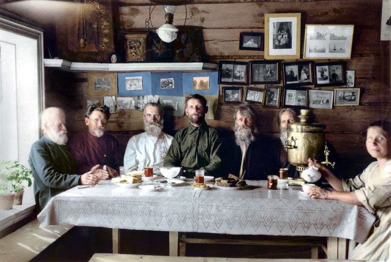 1920. Михаил Калинин в доме своей матери пьёт чай среди односельчан. Тверская губерния, село Верхняя Троица