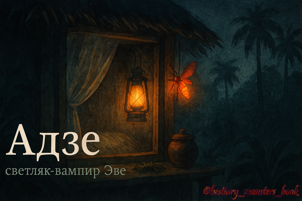 Кровь, болезнь, защита Вступление Ночная деревня притихла, и единственный свет — звёзды да редкие огоньки насекомых. Один из них висит у окна дольше остальных: красноватая искра будто прислушивается, ищет щель в раме. Адзе в образе светляка проходит туда, где не пройдёт человек, — и там, где думают о жаре и комарах, фольклор народов эве (Гана, Того, Бенин) рассказывает другую историю. 1) Откуда он взялся Где и кто рассказывает. Истории об адзе живут у народов эве на побережье Гвинейского залива — восток Ганы, Того, запад Бенина — и в соседних смешанных общинах. Это районы, где ночи тёплые и влажные, окна долго остаются открытыми, а насекомые — не фон, а среда обитания. В таком мире «ночной гость у окна» — не просто образ, а ежедневная вероятность. Два облика — одна тревога. В одних версиях адзе — насекомое (чаще светляк): он прилипает к раме, проходит через щель и «пьёт силу» спящих. В других — человек-носитель (одержимый или «колдовской»), которого кормит тот же ночной голод. Это н