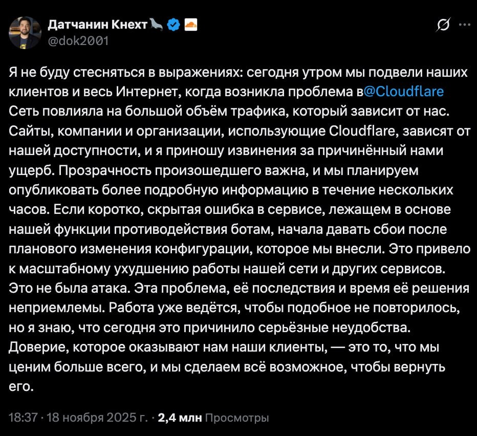 РКН извиняется за блокировки: просто представьте себе такую ситуацию в РФ... Cloudflare, на котором держится половина интернета, вчера опять прилёг. На этот раз пришлось извиняться. И они извинились.