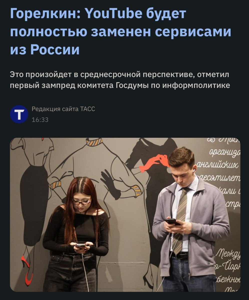 Вы там пустырник принимайте, что ли «Уверены, что в среднесрочной перспективе мы полностью заменим YouTube, который, к сожалению, стал оружием пропаганды. Его очень активно используют западные страны в информационной войне. Суверенитет и цифровой суверенитет — это очень дорогое удовольствие, требующее не только инвестиций, но и людей. Это большая работа» — Горелкин Следите за руками: Сервис, где каждый смотрит, что хочет — это оружие пропаганды. Война — это мир. Свобода — это рабство.