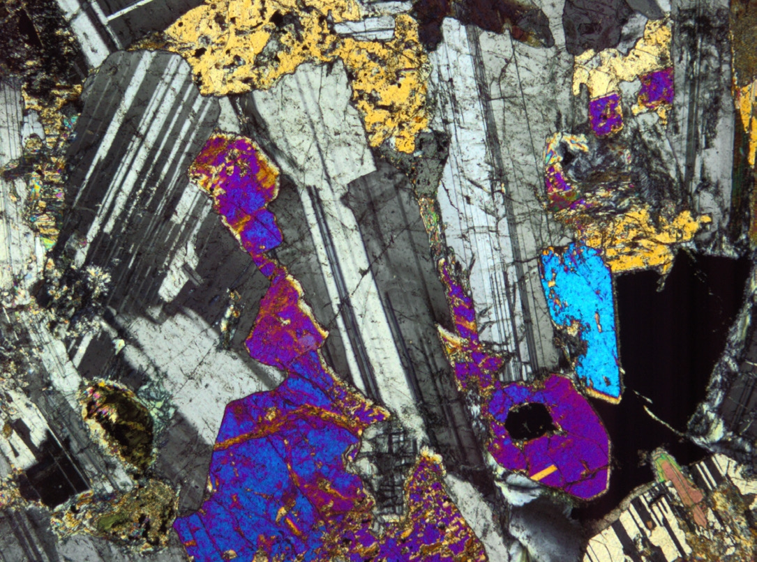Современные оптические микроскопы имеют увеличение до 900–1100 крат, что даёт возможность рассматривать объекты размером до первых микрон. Но есть одна особенность геологического микроскопа – он обязан быть поляризационным. В конструкцию добавлены аж два поляризатора (тех же самых, что и у экрана смартфона). Один установлен у источника света, второй около окуляра и их оптические оси ориентированы перпендикулярно друг другу. При этом первый смонтирован жёстко, а второй можно извлекать и смотреть с ним и без него. Суть в том, что если свет представить как электромагнитную волну в объёме, то он будет колебаться по кругу в плоскости перпендикулярной направлению светового луча. Поляризатор, задаёт нам линейное направление колебания, отсекая при этом остальные за ненадобностью. Световой луч идёт от источника света, проходит через первый поляризатор, потом через минерал, затем через второй поляризатор и попадает в окуляр. Минерал – это кристаллическая решётка, которая также способна искажать направление колебания света. У кристаллической решётки есть так называемые оптические оси: длинная и короткая, от них и зависит характер искажения проходящего светового луча. Используя поворотный столик, извлекая или включая второй поляризатор и используя ещё некоторые специфические инструменты, мы подбираем оптические свойства минералов, по которым происходит точная диагностика. В породе мы надёжно определяем вначале комплекс минералов, а затем по их соотношению и структурно-текстурным особенностям тип породы и условия её образования.