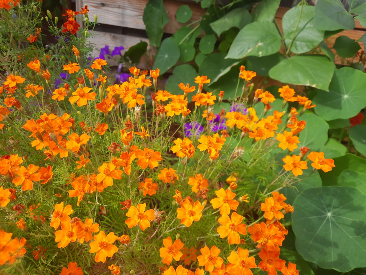 Одни из моих любимых однолетников - бархатцы тонколистные. Из трех групп тагетесов - прямостоячие, отклоненные и тонколистные - последние наименее популярны. Очень жаль, ведь это замечательные цветы. Яркие, неприхотливые, изящные. А еще непредсказуемые. Если не знать, какой у них характер, можно ошибиться с посадкой или, наоборот, упустить возможность. Дело в том, что в юности бархатец тонколистный - довольно субтильное растение. Не зря он тонколистный - листочки у него узенькие, само растение субтильное. Но вот проходит время, молодые бархатцы развиваются, прячась в компании других растений. И вдруг - взрыв. Тагетес тонколистный превращается в шар, довольно крупный, до 50-60 см в диаметре. И вспыхивает цветением. Каждый цветочек небольшой, а вместе впечатляют. В пору максимального цветения кусты полностью покрыты россыпью мелких простых (немахровых) цветочков разных оттенков - от лимонного до бордового. Если посадить тонколистный бархатец на свободе, кустик будет идеально круглый и к