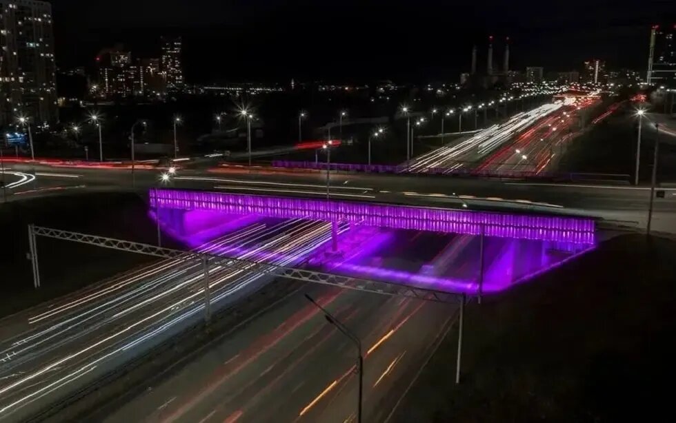 На главной магистрали Уфы разными цветами светятся теперь шесть путепроводов. Зеленым — на Октябрьской Революции, синим — в створе Заки Валиди, золотисто-медовым — на Мингажева, бирюзовым — на Галле, красным — на улице 50 лет СССР и фиолетовым — на Айской.