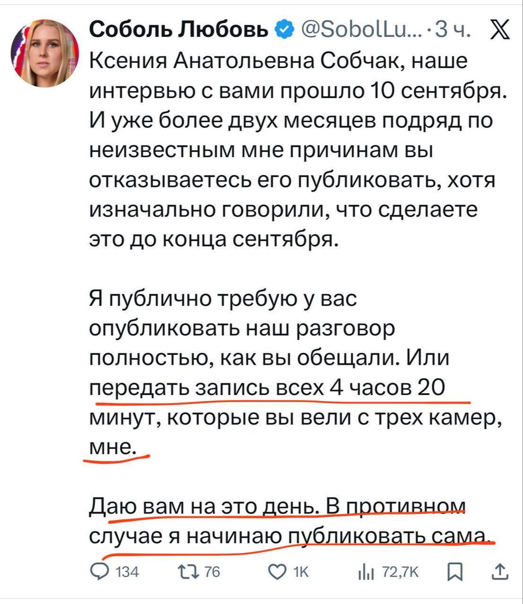 Сбежавшая в "свободную" Европу активная оппозиционерка все еще мечтающая возглавить власть в РФ Любовь Соболь опубликовала в соцсетях очередной злобный пост. В этот раз Любовь против Ксении Собчак, которая - о ужас! - уже третий месяц не выпускает интервью с Любовью. "Ксения Анатольевна Собчак, наше интервью с вами прошло 10 сентября. И уже более двух месяцев подряд по неизвестным мне причинам вы отказываетесь его публиковать, хотя изначально говорили, что сделаете это до конца сентября", - начала явно скучающая в "свободных европах" так и не ставшая лидером российской оппозиции, несмотря на свое огромное желание, Соболь. "Я публично требую у вас опубликовать наш разговор полностью, как вы и обещали. Или передать запись всех 4 часов 20 минут, которые вы вели с трех камер мне. Даю вам на это день. В противном случае, я пишу в спортлото начинаю публиковать сама!" - угрожает в соцсетях экс-помощница Навального Любовь Соболь. Ранее неугомонная Соболь уже жаловалась антироссийским СМИ на т