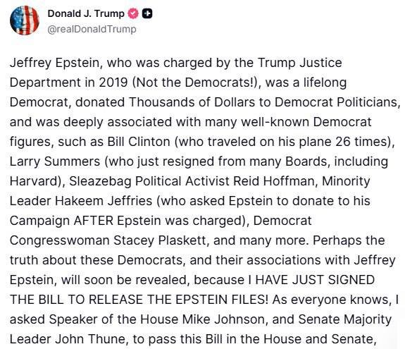 😉🇺🇸Трамп подписал закон о публикации "всех файлов Эпштейна”. Старый американский лис заявил, что обнародование материалов по этому делу вскроет правду о Билле Клинтоне и других демократах (а о республиканцах?). Теперь минюст США должен в течение 30 дней раскрыть все не засекреченные материалы. В документе также указано, что министр юстиции Пэм Бонди вправе изъять из публикации сведения, которые “могли бы поставить под угрозу активное федеральное расследование или продолжающееся уголовное преследование”. В общем все ясно - Дони наносит очередной по своим оппонентам. @Zабугорье - оставайтесь с нами