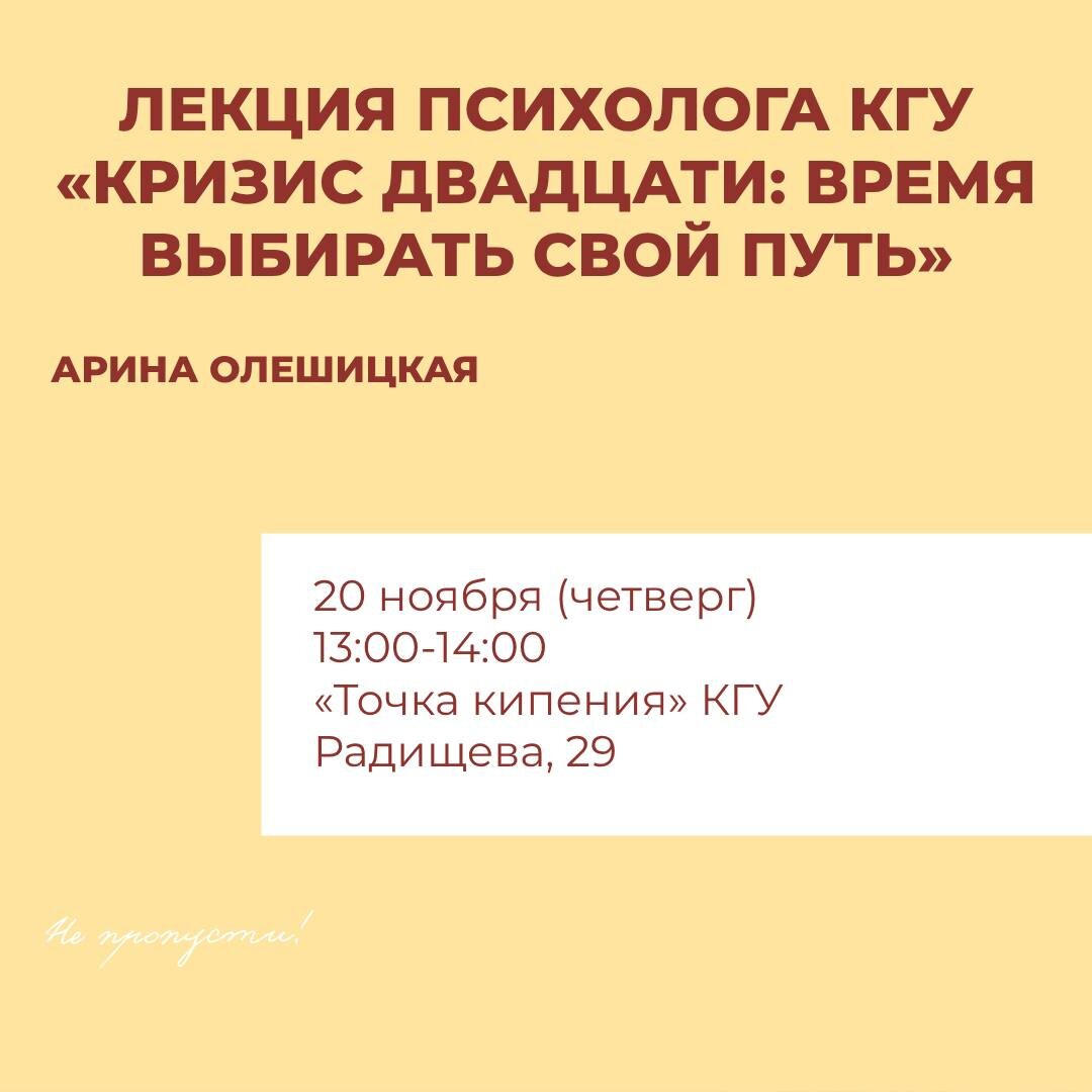 Напоминание! Уже сегодня! 💡Лекция психолога КГУ Арины Олешицкой «Кризис двадцати: время выбирать свой путь» 13:00-14:00 «Точка кипения» КГУ Радищева, 29 «Я выбрал не ту профессию» «У меня нет серьезных отношений, как у других» Я трачу лучшие годы неизвестно на что» Знакомо? Сейчас вы на пороге взрослой жизни. Перед вами открывается масса возможностей и полная свобода выбора, но вместо ожидаемой радости приходит тревожное состояние. Возникают мучительные вопросы: кто я на самом деле? чего действительно хочу? какую профессию выбрать? каким путём идти? При этом кажется, что другие уже определились - строят карьеру, создают семьи, - а ты всё ещё в растерянности и не знаешь, как распорядиться собственной жизнью. Такое состояние - проявление «кризиса двадцати». Важно понимать, что это естественный, хоть и непростой этап личностного развития. Он не означает, что с вами что‑то не так или вы отстаёте от жизни - вы просто находитесь в процессе становления своей личности. Приглашаю