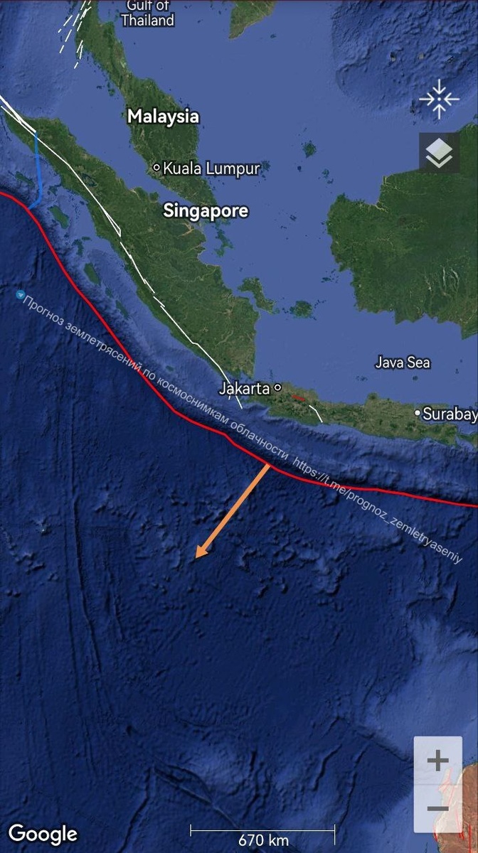 Между Явой и Суматрой наблюдается ОСТИ протяжённостью 1200+ км. Есть вероятность очередного мощного извержения 🌋, либо сильной сейсмики в данной зоне в течение 7 дней. ===== Between Java and Sumatra, there is a 1200+ km CSTI. There is a possibility of another powerful 🌋eruption or strong seismic activity in this area within 7 days.