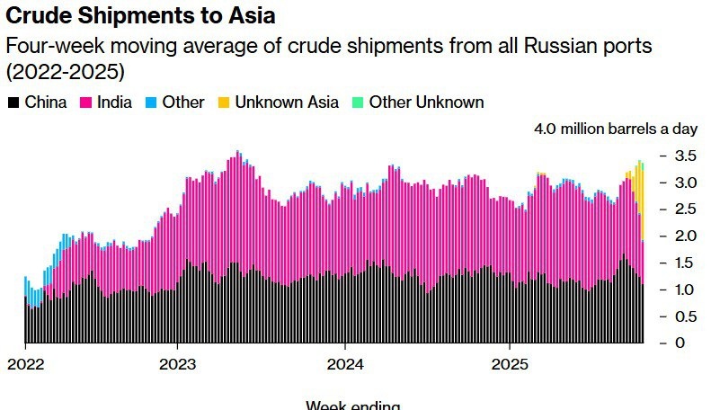 Объём поставок российской нефти в Азию Диаграмма по октябрь (Week Ending) В результате санкций, поставки нефти в октябре почти не менялись Индия даже отчитывается перед США о сокращении закупок российской нефти. Но цены снижаются и растут издержки (посредники получают прибыль) Обратите внимание на рост Unknown Asia и появление Other Unknown Источник ru.tradingview.com/news/barchart%3A9ac6a637a094b%3A0-crude-prices-rally-on-reduced-russian-supplies-and-renewed-middle-east-risks/