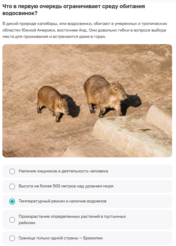 Сама викторина. "Активный гражданин" начисляет 40 баллов за указание правильных ответов викторины. Водоемы для капибар не просто место для купания. Их жесткая шерсть быстро намокает, и вода помогает им регулировать температуру тела, так как у этих грызунов нет потовых желез. Без доступа к воде для охлаждения капибары могут получить тепловой удар даже при умеренной жаре. Капибары часто спят в воде, оставляя на поверхности только ноздри, глаза и уши. Это уникальная адаптация, позволяющая им одновременно отдыхать и оставаться настороже от наземных хищников. Таким образом, их длительное пребывание в воде это и терморегуляция, и стратегия выживания. Как и у многих грызунов, зубы капибар растут на протяжении всей жизни. Поедание грубых растительных кормов, включая кору и стебли, позволяет им стачивать резцы. В зоопарках для этого также используют специальные минеральные камни-точилки. Совместное содержание капибар с гигантскими муравьедами в одном павильоне - это пример зоогеографич