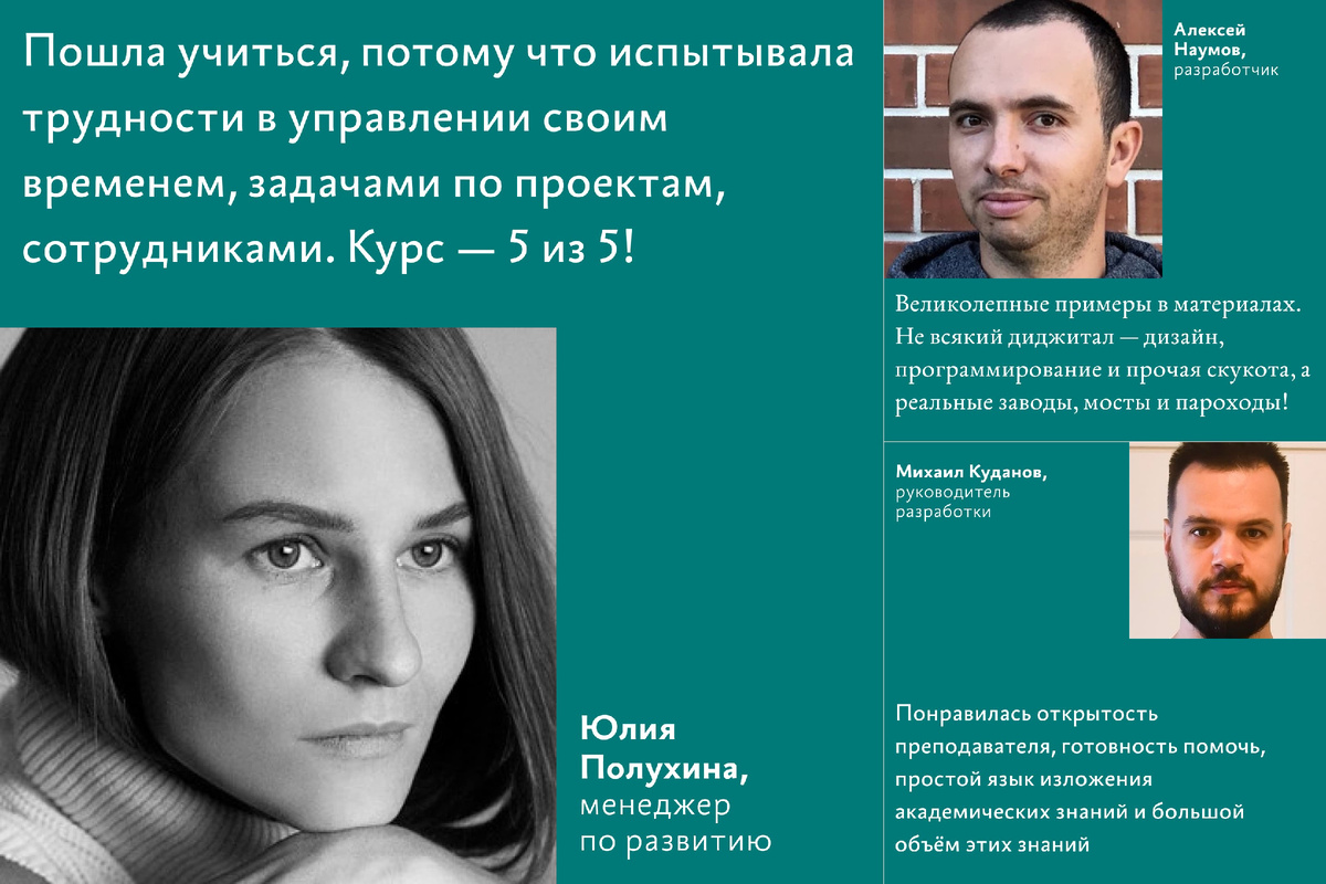 «Пошла учиться, потому что испытывала трудности в управлении своим временем, задачами по проектам, сотрудниками. Курс — 5 из 5!».