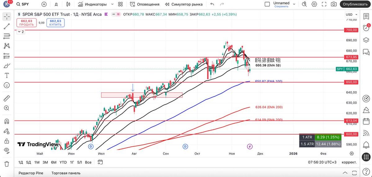 ВЫВОД: в данный момент также нет новых ключей. $SPY, $QQQ, $IXIC реагируют на скользящие сверху, и по $VIX также нет явных подсказок = наблюдаем. Но, как говорил еще в обзоре, нам важен недельный контекст. Например, за последние два торговых дня можно увидеть возврат за 10 EMA W, нарисовать длинный фитиль снизу = это будет хорошим триггером для добавления позиций. А пока что свеча формируется, и ничего определенного сказать не можем. #spy #технический_анализ #америка #трейдинг_сша #фондовый_рынок #обзор #вывод #qqq #vix #smh #mags #xlk #ixic