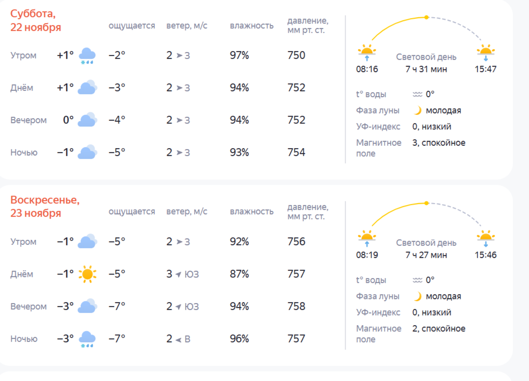 Пасмурная погода ожидает жителей Костромы на ближайших выходных, 22 и 23 ноября. Синоптики прогнозируют минусовые температуры, а также осадки. Так, суббота, 22 ноября, начнется для костромичей с +1 градуса. В это же время в городе пойдет дождь со снегом. К счастью, осадки продлятся недолго – они закончатся ближе к полудню. Днем температура воздуха в областной столице не изменится. Вечером ожидается ноль градусов, а ночью – до -1. В городе подует западный ветер со скоростью 2 метра в секунду. По ощущениям будет казаться, что на улице от -2 до -5 градусов. Утром в воскресенье, 23 ноября, термометры покажут -1 градус. Ожидается пасмурная погода. Днем выглянет солнце, но ненадолго. Температура останется без изменений. Во второй половине дня прогнозируют до -3 градусов. Ночью пойдет дождь со снегом. Порывы юго-западного ветра составят 2-3 метра в секунду. Ощущаться это будет как -5…-7 градусов. Фото: Яндекс.Погода, K1NEWS.RU.