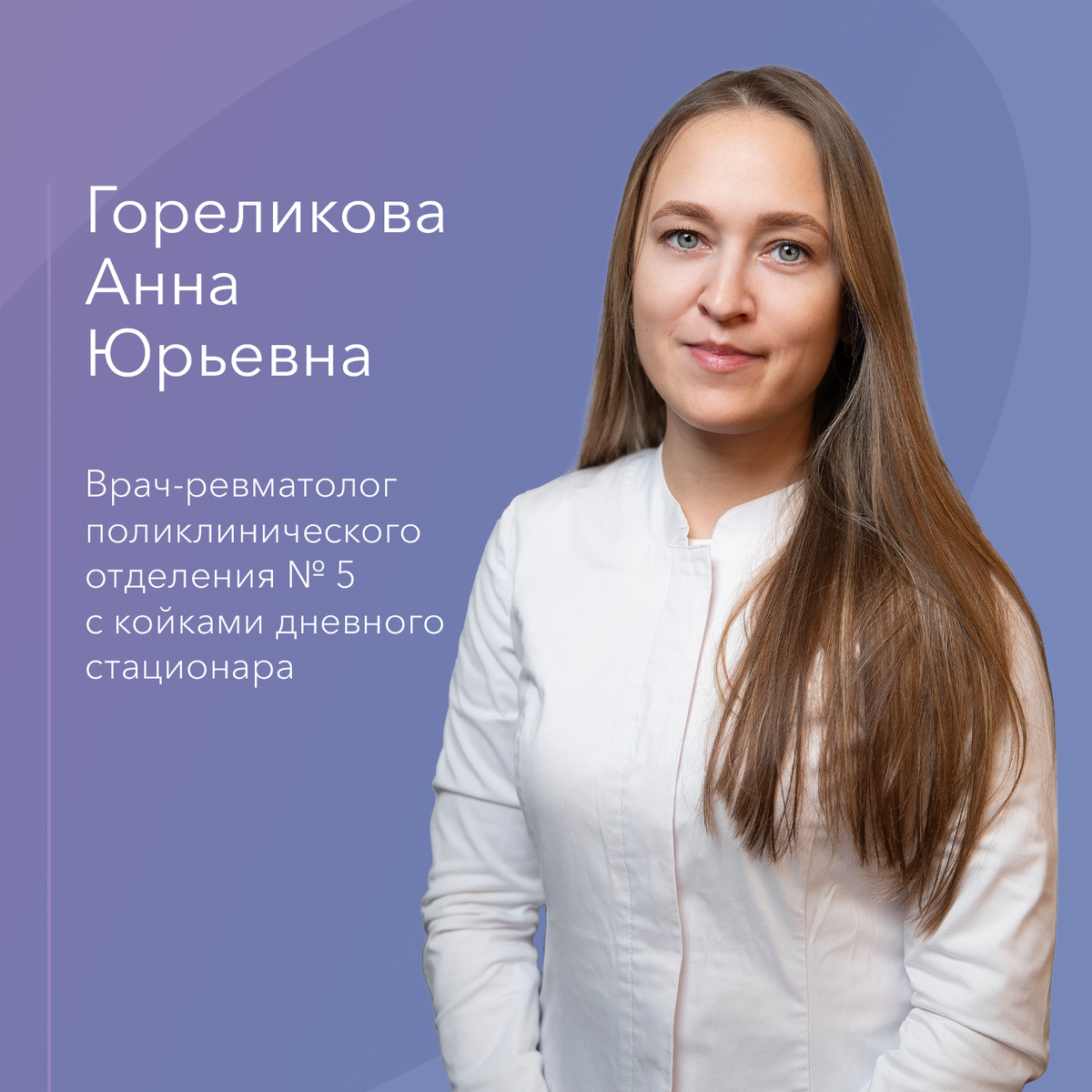 Рады представить вам нового врача-ревматолога поликлинического отделения №5 — Анну Юрьевну Гореликову. Запись на приём к Анне Юрьевне уже открыта. Врач ведёт приём по понедельникам с 09:00 до 14:00 в филиале на площади Стачек, 5. За пять лет работы в ревматологии Анна Юрьевна зарекомендовала себя как вдумчивый и чуткий специалист. Она умеет находить персональный подход к каждому пациенту, а коллеги отмечают её готовность к совместному поиску решений в сложных клинических случаях. Анна Юрьевна не только применяет свои знания на практике, но и активно развивается в профессии: она прошла курсы повышения квалификации по лечению иммуновоспалительных заболеваний и диффузных патологий соединительной ткани. Её практический опыт дополняется научной работой — врач является призёром всероссийских конкурсов и регулярно выступает с докладами на профильных конференциях. Приветствуем Анну Юрьевну в нашем большом профессиональном коллективе. Желаем коллеге вдохновения в работе, новых побед и благод