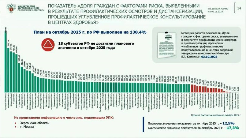 20 ноября 2025 г. – Официальный отчет Министерства здравоохранения РФ по итогам октября выявил системный срыв в одном из ключевых направлений нацпроекта «Здравоохранение». Несмотря на перевыполнение ряда планов по популяризации ЗОЖ, российское здравоохранение не смогло обеспечить должный уровень диспансерного наблюдения за гражданами с факторами риска. Этот целевой показатель, установленный на октябрь 2025 года, оказался невыполненным в 38 субъектах РФ, что признал замминистра здравоохранения Евгений Камкин. Выступая 19 ноября на Национальном конгрессе терапевтов, Евгений Камкин констатировал, что цель по охвату диспансерным наблюдением граждан из групп риска оказалась самой сложной. Вместо плановых 2,33 млн человек под наблюдение попало лишь 1,69 млн, что составляет 72,6% от целевого значения. «Не удалось достичь только показателя охвата диспансерным наблюдением граждан с факторами риска. Причинами стали недостаточные усилия по внедрению дополнительных мер на уровне регионов», — заяви