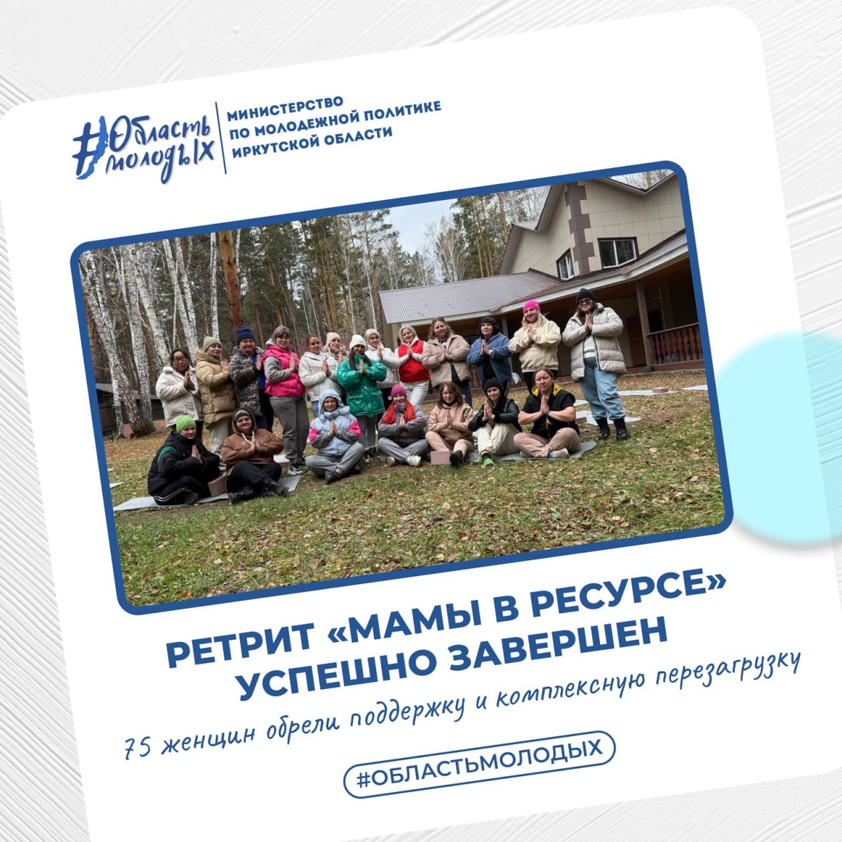 ✨ Проект «Ретрит «Мамы в ресурсе» успешно завершен: 75 женщин обрели поддержку и комплексную перезагрузку! Итоги проекта «Ретрит «Мамы в ресурсе», победителя грантового конкурса "Росмолодежь.Гранты" в рамках Форума сельской молодежи Иркутской области при поддержке Министерства по молодежной политике Иркутской области. 📎 Ежедневные заботы о детях и семье часто приводят современных мам к эмоциональному выгоранию, дефициту времени на себя и ощутимой потере личного ресурса. Это негативно сказывается на качестве жизни самой женщины и благополучии всей семьи. В рамках проекта были организованы три насыщенных потока ретритов, предоставивших 25 мамам в каждом потоке возможность для восстановления и личностного роста. В программе «Мамы в ресурсе» участницы получили: 🔵 Осознанные физические практики: адаптированные занятия йогой, направленные на укрепление тела, улучшение осанки и снятие физического напряжения; 🔵 Глубокая работа с внутренним состоянием: эффективные дыхательные техники,