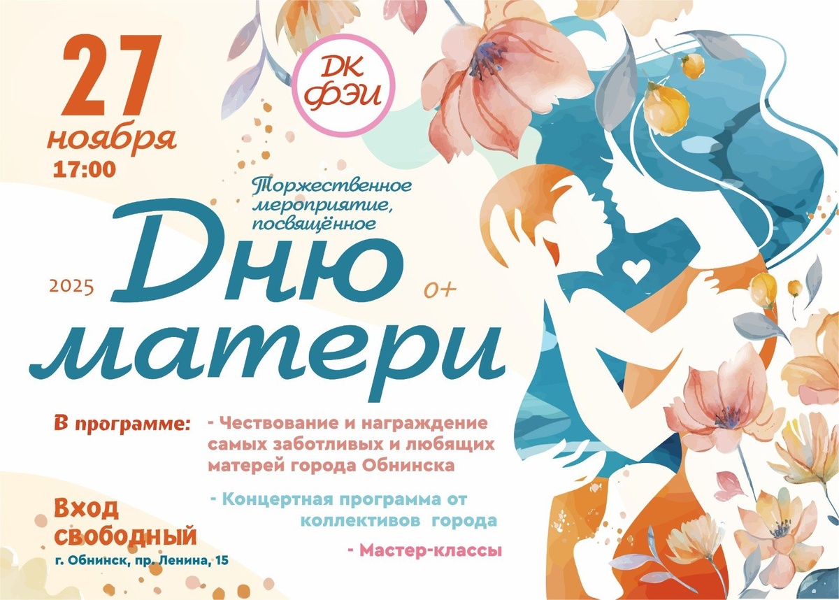 🎉27 ноября в 17:00 в ДК ФЭИ в Обнинске состоится торжественное мероприятие, посвящённое Дню матери — празднику, который даёт нам