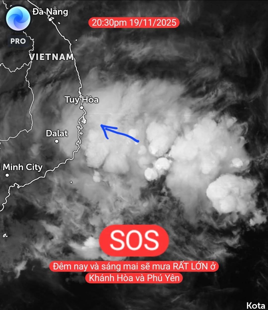 🆘️ УЖАСНЫЙ ДОЖДЬ – ИСТОРИЧЕСКОЕ НАВОДНЕНИЕ 20:30 19.11.2025 - Гигантские тучи продолжают двигаться в направлении районов Кханьхоа и Фуйен. Сегодня ночью и завтра утром ожидаются сильные дожди, в основном в прибрежных и центральных районах. - Сброс воды с ГЭС на реке Баха по-прежнему составляет 15 600 м³/с, в то время как объём воды, поступающей в водохранилище, составляет 16 120 м³/с. Возможно, для обеспечения безопасности водохранилища потребуется увеличить сброс воды до более высокого уровня. - Уровень воды в реке на станции Тхатьхоа в провинции Биньдинь составляет 9,1 м, что на 1 м превышает уровень тревоги 3. Тенденция к повышению. – Уровень воды в реке Ки Ло (станция Ха Банг, впадает в плотину Тамзянг, Фуйен) составляет 12,55 м, что ниже пикового значения сегодня днём (13,9 м), но всё ещё на 3 м выше уровня 3 (уровень 3 – 9,5 м). – Уровень воды в реке Кунг Сон (река Ба, ниже по течению от гидроэлектростанции на реке Ба, впадает в центр Фуйена) составляет 40,82 м, что на 0,92