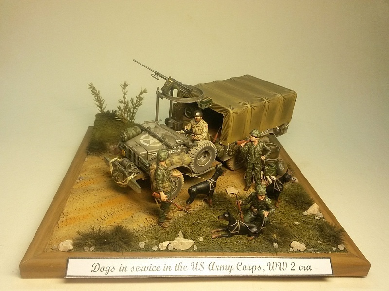 "Dogs in service in the US Army Corps, WW 2 era " - Собаки на службе армии США, 2 МВ. Арнольд Арчебасов AFV, Master Box, 1:35 ================================ На ваш суд выкладываю свою виньетку " Собаки на службе ". Использовался Додж WC 63 6x6, и набор кинологов с собаками от МастерБокса. Кит от AFV очень понравился, кинологи с собаками тоже ничего ;), добавил обвес : скатки, фляги, каски, сумки - кажется от Тамии, и кое-что из запасов: второй пулёмет в кузове, коробки с хавчиком , бочку и ящик. Сделал открывающею левую половинку капота и опускающее ветровое стекло. Всё остальное самодел : подставка 18х19, шпаклёвка, песочек. камешки и трава- сан.тех.лён. Краска, смывка - Тамия, пигменты- пастель. ================================ ===============================