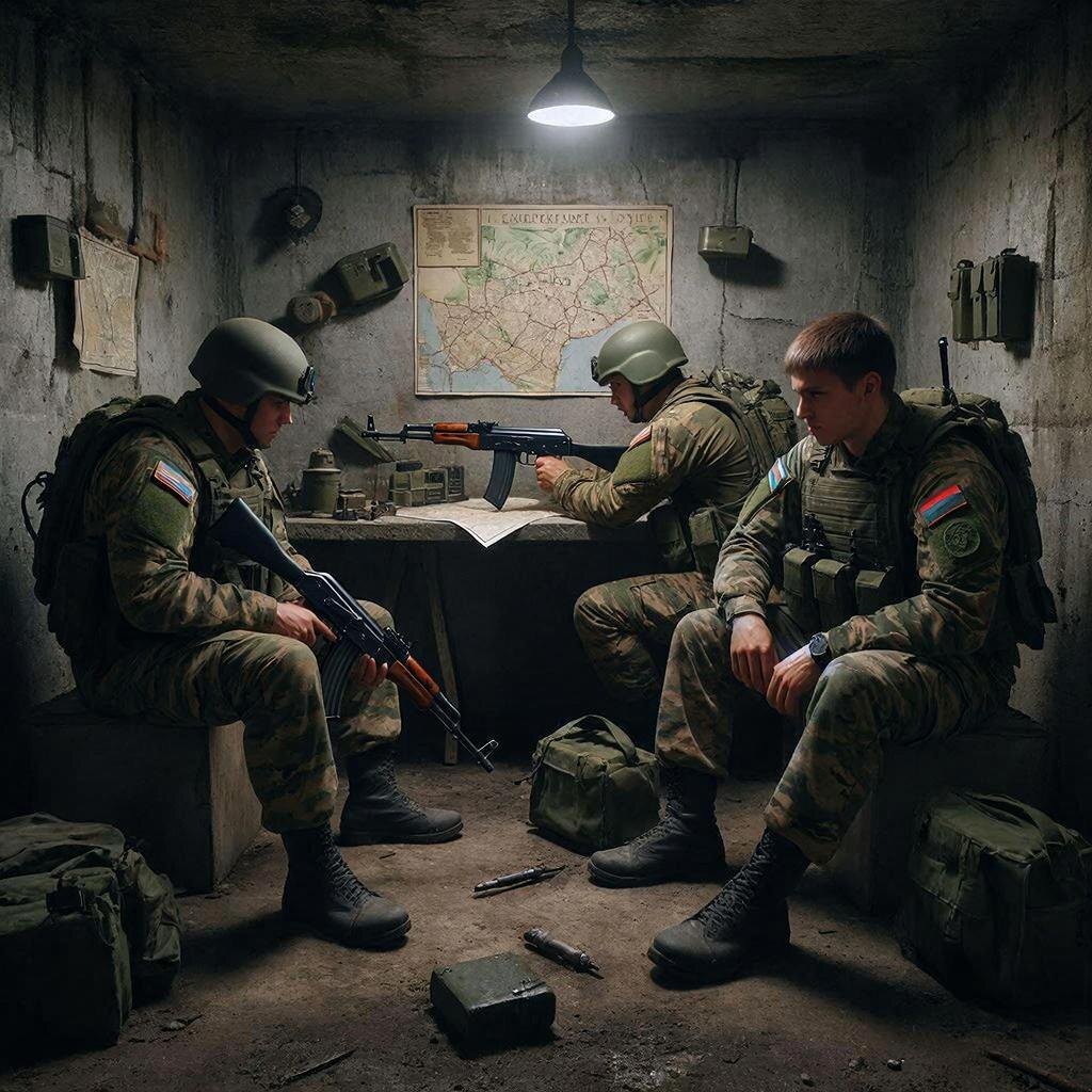 Теперь они стояли посреди пустоты, окружённые мерцающими линиями и фигурами, словно нарисованными невидимой рукой. Их форма одежды изменилась: каски стали прозрачными шлемами, оружие приобрело футуристичный вид, а тела покрылись защитными костюмами, сияющими мягким голубым светом.