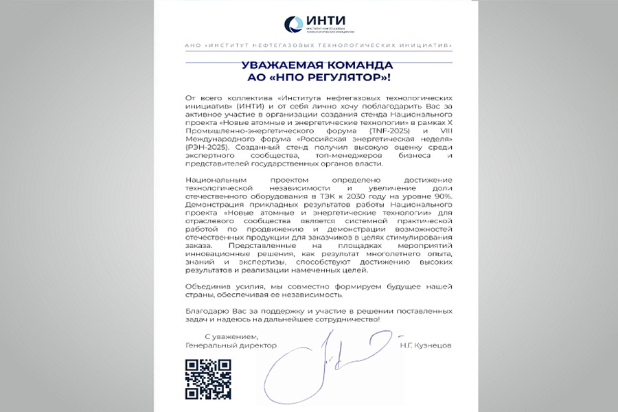 «От всего коллектива «Института нефтегазовых технологических инициатив» (ИНТИ) и от себя лично хочу поблагодарить Вас за активное участие в организации создания стенда Национального проекта «Новые атомные и энергетические технологии» в рамках Х Промышленно-энергетического форума (TNF-2025) и VIII Международного форума «Российская энергетическая неделя» (РЭН-2025). Созданный стенд получил высокую оценку среди экспертного сообщества, топ-менеджеров бизнеса и представителей государственных органов власти», - отметил генеральный директор «АНО «ИНТИ» Николай Кузнецов. Справка: НПО «Регулят