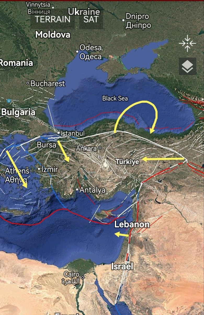 В ответ на пост Над Турцией сформировался облачный сейсмотектонический индикатор протяженностью более 2000 км (фото 2-3). Судя по форме облачной структуры и ее смещению, трассируется граница Анатолийской плиты и часть Аравийской. На фото 5 в моменте чуть раньше можно также рассмотреть облачные трассеры от рифтовой зоны Черного моря, которые потом трансформируются в контуры Анатолийской плиты с поворотом против часовой стрелки. Протяжённость ОСТИ дает потенциальную магнитуду до М7.8+/-0.2. Вероятность очень сильного землетрясения по данной зоне имеется до конца ноября. ===== A cloud seismotectonic indicator with a length of more than 2000 km has formed over Turkey. Judging by the shape of the cloud structure and its displacement, the boundary of the Anatolian plate and part of the Arabian Plate is traced. The length of the CSTI gives a potential magnitude of up to M7.8+/-0.2. There is a possibility of a very strong earthquake in this area until the end of November.