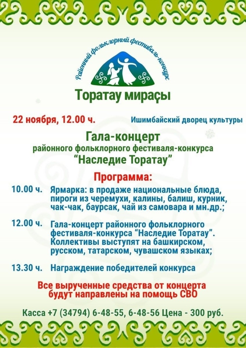 В ближайшую субботу, 22 ноября, в Ишимбайском Дворце культуры состоится гала-концерт районного фольклорного фестиваля «Наследие Торатау». Участники исполнят песни и национальные мелодии народов республики. Концерт начнётся в 12 часов. А уже в 10 утра во Дворце культуры откроется ярмарка-продажа национальных блюд, пирогов и сладостей. Как сообщил глава администрации Ишимбайского района Азат Ишемгулов, билет на концерт стоит 300 рублей, приобрести его можно в кассах ДК. Все вырученные средства пойдут на поддержку наших воинов-земляков – участников специальной военной операции. «Этот вечер – не просто праздник. Это общий вклад в победу. Приходите всей семьёй. Поддержим наших защитников силой искусства, теплом своих сердец и единством», – подчеркнул Азат Ишемгулов. 0+