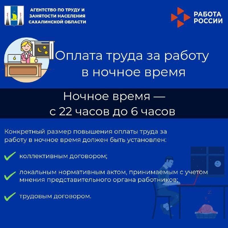 Работа в ночное время: что важно знать ⚠️Некоторые работодатели до сих пор не указывают конкретный размер оплаты за работу в ночные часы, хотя закон требует это делать. ☝️Чтобы вам было проще ориентироваться, мы публикуем карточки с понятными разъяснениями: как оплачивается ночная работа и кто не может быть привлечен к таким сменам. ❓Если у вас есть вопросы по оплате труда, специалисты Агентства по труду и занятости населения Сахалинской области проводят консультации каждую неделю. 📞Позвонить можно по вторникам с 15:00 до 17:00 по телефону 8 (4242) 72-74-35. @CZNKORSAKOV
