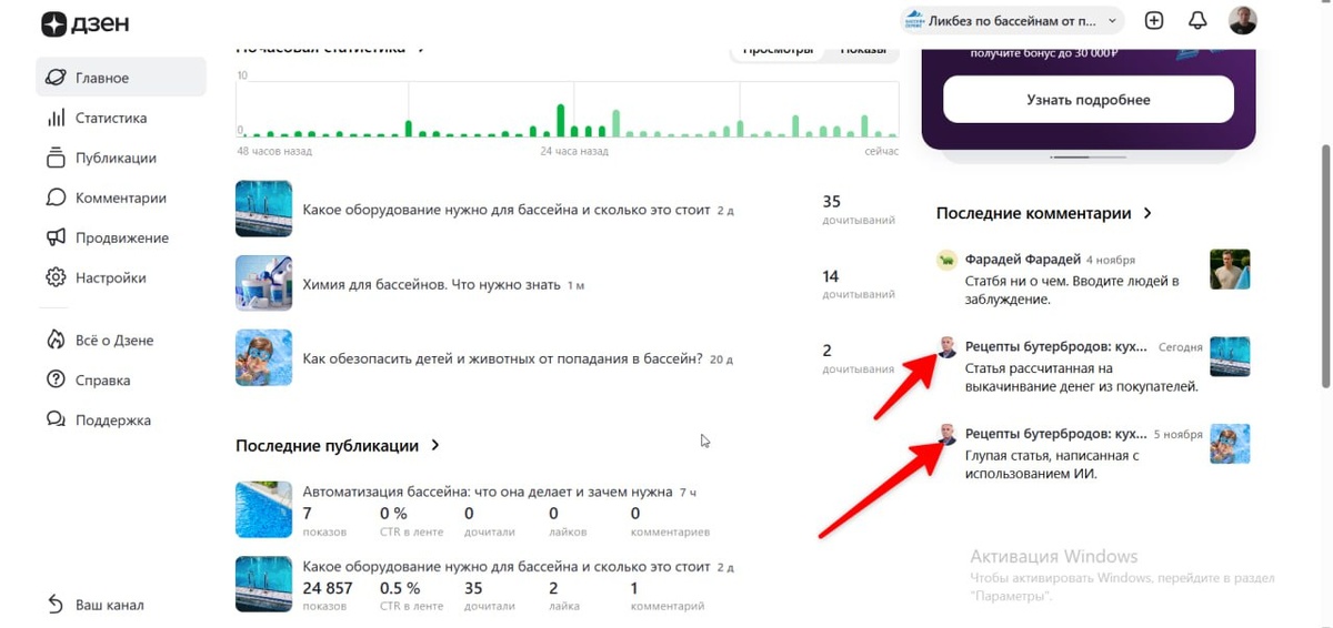 Копирайтер решил убить наш блог. Нанял для клиента, с которым работаем уже продолжительное время, 3х копирайтеров для раскрутки блога по тематике «Оборудование для бассейнов» на Яндекс Дзен. После написания нескольких статей каждым копирайтером, определились, с кем будем работать дальше, а с кем расстанемся. С кем расстались, естественно, оплатили деньги, как положено, но он затаил обиду. И начал засыпать наш блог на Дзен разными токсичными комментариями, что-то типа «ваши статьи написаны нейронкой» и всё в таком роде. К слову сказать, всех копирайтеров нашел на бирже фриланса, обсудили все нюансы, что нужно написать одну или несколько статей, чтобы понять, подходите ли вы нам, если нет, то до свидания. Как говорится, не срослось у нас с вами сотрудничество. Так он, видимо, так затаил обиду, что из 3-х кандидатов уволили только его, и начал свою обиду вымещать на нашем блоге. Я вот таких, конечно, не понимаю, если есть обида, так выскажись и всё, зачем токсиковать?! Для меня остаёт