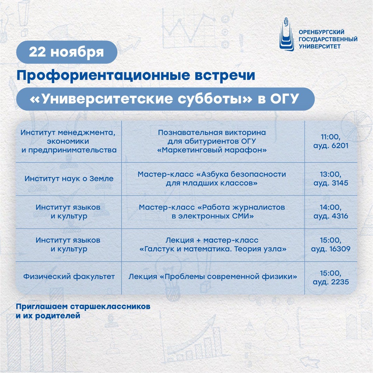 Ученье свет💡 В ОГУ продолжаются открытые профориентационные мероприятия для школьников и их родителей 🤩 22 ноября в рамках «Университетских суббот» все желающие смогут посетить научно-образовательные лекции, а также проверить свою эрудицию на викторине и узнать много интересного на увлекательных мастер-классах. А 21 и 22 ноября для гостей свои двери откроют Институт математики и информационных технологий, Институт общественных наук, Институт энергетики, электроники и связи, а также факультет прикладной биотехнологии и инженерии. ВАЖНО! Пропуск в учебные корпуса осуществляется при наличии документа, удостоверяющего личность (свидетельство о рождении или паспорт). 📌 Полное расписание «Университетских суббот» доступно по ссылке 📞 Задать дополнительные вопросы можно по номеру (35-32) 37-25-55. #ОГУ #в_ОГУ #OSU #УниверситетскиеСубботы