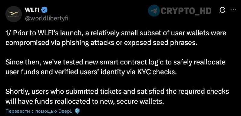 #wlfi ⚠️ В World Liberty Financial сообщили, что перед запуском часть пользовательских кошельков оказалась скомпрометирована. Из-за этого в WLFI заморозили затронутые адреса, провели повторную KYC-верификацию владельцев и создали новую логику смарт-контрактов, которая позволяет безопасно перенести средства на новые кошельки. В компании уточнили, что проблема возникла не на стороне платформы, а из-за уязвимостей третьих сервисов. Средства перераспределят между пользователями, которые завершат проверку личности. Ранее: - крупнейший скам - блокировка Джастина Сана - просьба Джастина Сана Crypto Headlines