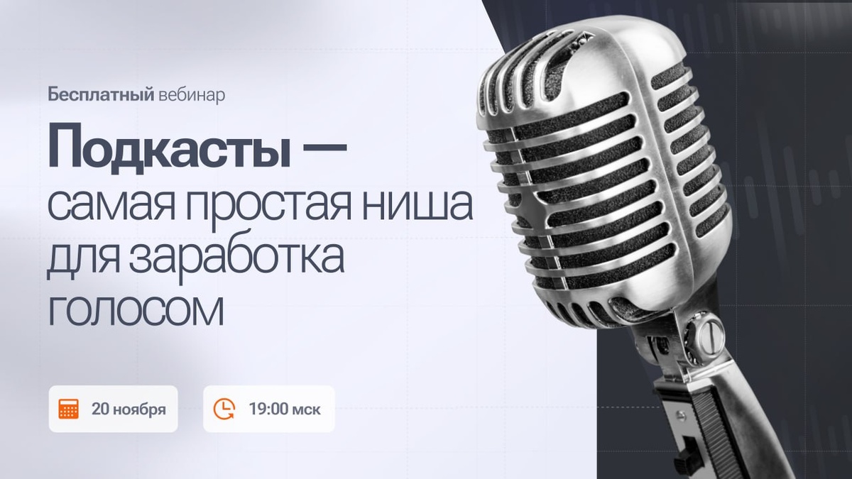 Самореализация ➕ Творчество ➕ Заработок 🟰 ТВОЙ СОБСТВЕННЫЙ ПОДКАСТ Подкаст объединяет в себе все то, что вы так любите в озвучке: 🟠Творческую реализацию 🟠Свободу самовыражения 🟠Уверенность в себе 🟠Дело, которое приносит удовольствие 🟠Стабильный доход и работу на себя И именно о подкастах мы поговорим сегодня 20 ноября в 19:00 по Москве на вебинаре «Подкасты — самая простая ниша для заработка голосом». Ссылка на регистрацию ➡️ ССЫЛКА На вебинаре мы подробно разберем: 🟢Что такое подкасты и какое направление самое перспективное 🟢Как подкаст может приносить доход, даже если у вас пока нет аудитории 🟢Как сделать подкаст в домашних условиях без дорогого оборудования 🟢Как создать подкаст, если вы обычный человек и не понимаете о чем говорить в выпусках 🟢Какие компетенции и навыки необходимы для заработка на подкастах Встречаемся ⏰ 20 ноября в 19:00 ➡️ ЖМИ ДЛЯ РЕГИСТРАЦИИ НА ВЕБ PS: А после вебинара каждый участник получит гайд «Идеальное название для подкаста». Круто, правда?