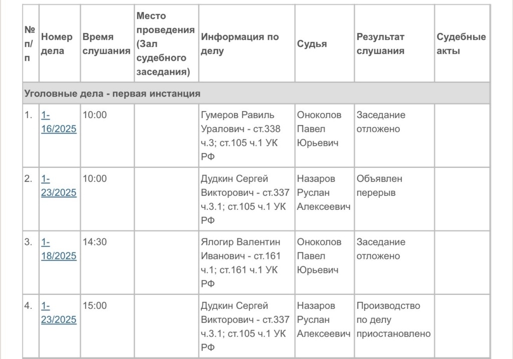 Знаменский гарнизонный военный суд Астраханской области приостановил рассмотрение дела военного Сергея Дудкина. Как указано на сайте суда, мужчину обвиняют в убийстве и самовольном оставлении части. Дело рассматривает судья Руслан Назаров. Поступило оно к нему 8 октября, а первое заседание, судя по истории дела, было назначено только спустя месяц. Но вот незадача – подсудимый скрылся, несмотря на подписку о невыезде. В результате слушание приостановили. Теперь Дудкин находится в федеральном розыске. Суд подробности дела не раскрывает, защита Сергея от комментариев также отказалась. Об этом сообщают наши коллеги из «Ъ». Сообщение В Астраханской области сбежал военный, обвиняемый в убийстве появились сначала на Астрахань.Ру последние новости региона.