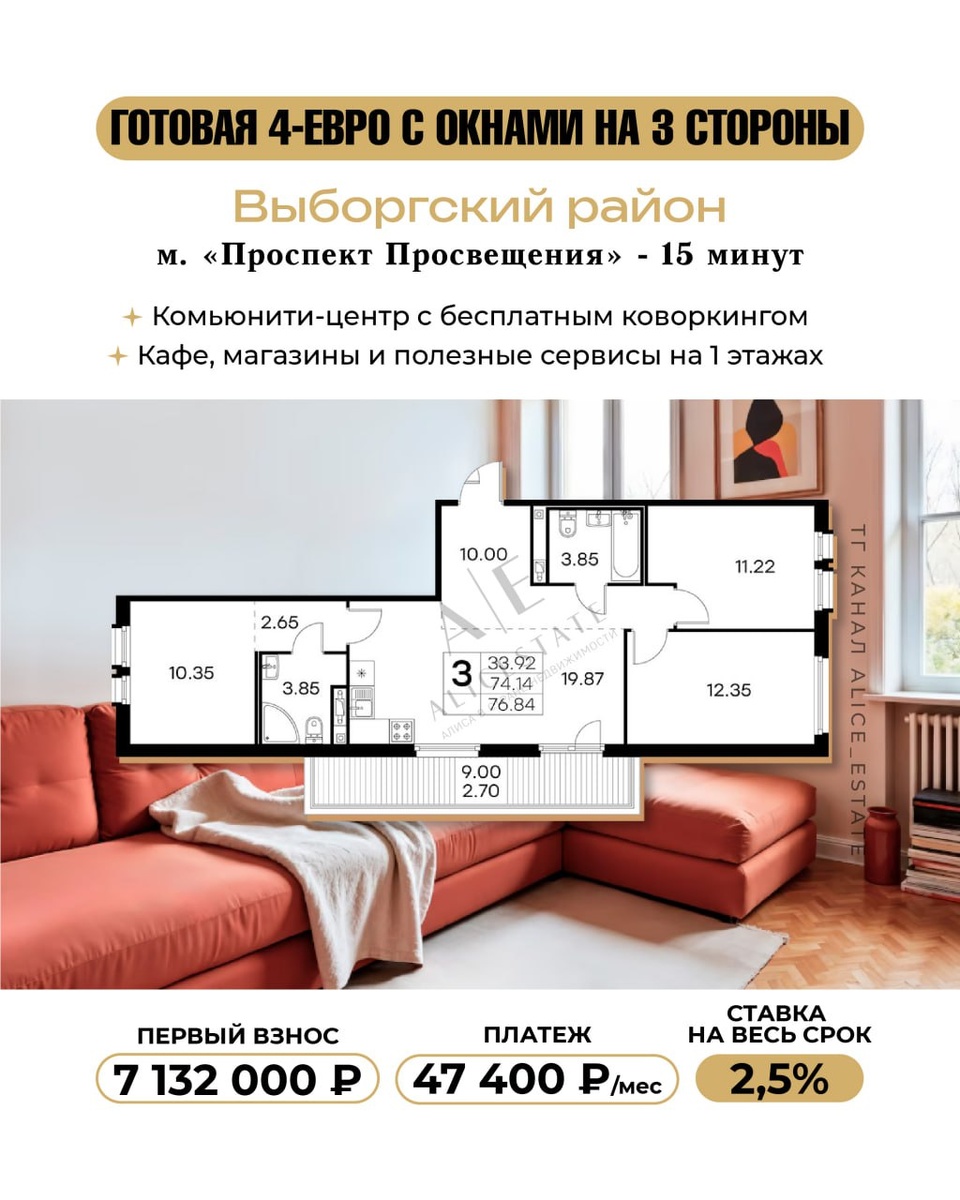 Готовая 3-ккв в Выборгском районе за 47 700 ₽/мес 🔥 🔽 самая минимальная ставка в Петербурге 🔽 ключи в течение нескольких месяцев 📍 м. «Проспект Просвещения» Комплекс комфорт-класса, объединенный единой галереей с приватным двором внутри. В пешей доступности школы и детские сады, а на территории есть комьюнити-центр с коворкингом. 🔻зеленое окружение 🔻удобный выезд на КАД 🔻в продаже есть квартиры с отделкой Подписывайтесь и ставьте ➕, чтобы получить персональные расчеты 💙