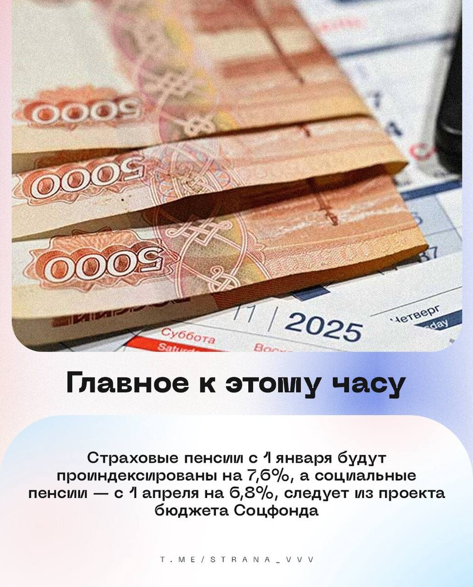 🇷🇺🇷🇺🇷🇺🇷🇺🇷🇺🇷🇺 на утро 20 ноября: 🔹Страховые пенсии с 1 января будут проиндексированы на 7,6%, а социальные с 1 апреля — на 6,8%, следует из проекта бюджета Соцфонда. 🔹В отношении экс-главы Краснодарского краевого суда Чернова могут возбудить уголовное дело. 🔹Десять пассажирских поездов были задержаны после возгорания вагонов на перегоне Шамары — Кордон, пожар уже ликвидирован. 🔹Житель ДНР пытался убить офицера ВС РФ британским пивом с ядом. 🔹Российские силы ПВО за ночь сбили 65 украинских беспилотников — Минобороны. UPD: Владимир Путин поздравил работников и ветеранов транспортной отрасли с профессиональным праздником. 💰Курсы валют: доллар — 📉80,94; евро — 📉93,78; юань — 📉11,34. 🇷🇺 В Стране. Подписаться