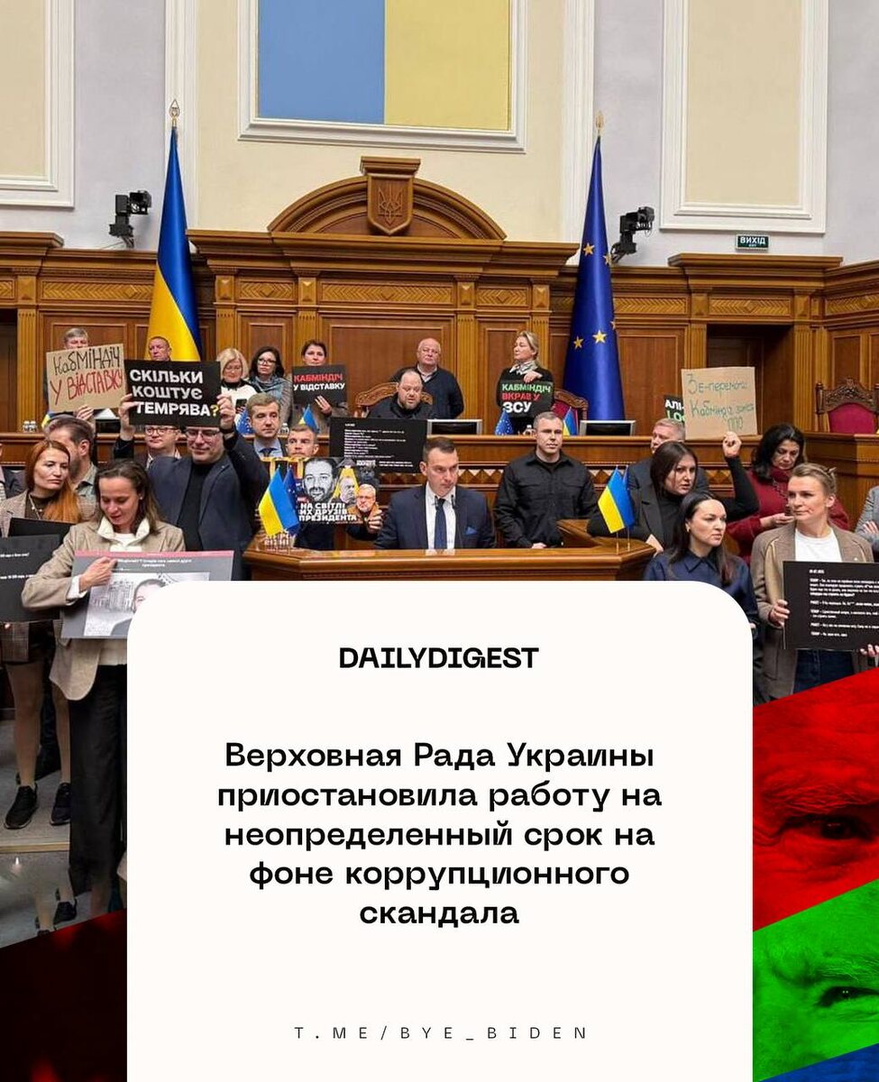 ☑️ Главные новости на утро 20 ноября: 🔹Верховная рада Украины приостановила работу на неопределенный срок на фоне коррупционного скандала. 🔹США разрабатывают предложения по урегулированию конфликта на Украине с учетом позиций Москвы и Киева — Рубио. 🔹План США по Украине предусматривает временный отказ Киева от вступления в НАТО — The Wall Street Journal. 🔹Трамп заявил, что подписал законопроект о публикации материалов по делу Эпштейна. 🔹Трамп одобрил новый мирный план по Украине — NBC News. 🔹Отставка правительства Украины может произойти уже в четверг — бывший украинский премьер-министр Николай Азаров. 🔹Бывший министр обороны Украины Рустем Умеров может дать показания против Зеленского — Апты Алаудинов. 👍 БайБайден. Подписаться
