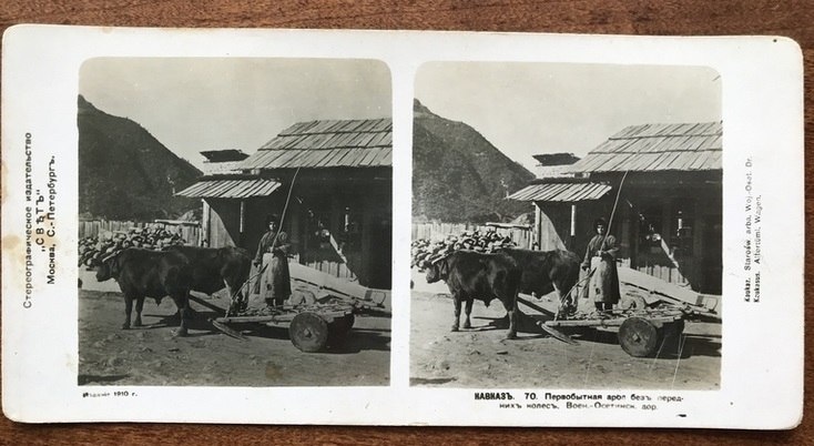 Подпись: «Первобытная арба без передних колес. Военно-Осетинская дорога». (1910 г.) Комментарий @OssetiaFB: «Арба-то возможно и первобытная, да только передние колеса ей и не нужны. В горах на двухколесной арбе ездить удобнее и безопаснее».