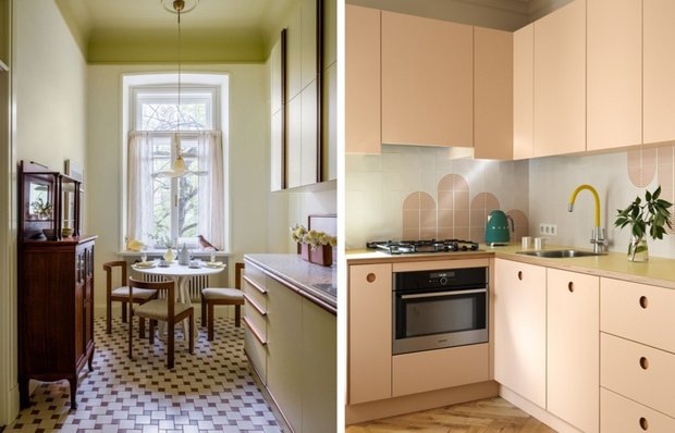 Дизайнер Елена Учаева преобразила трехкомнатную квартиру в Москве для художницы в доходном доме Ольги Гартман. Кухня выглядит необычно и привлекает внимание благодаря мебели цвета лимонного сорбета, разработанной по индивидуальным эскизам. Она состоит из двух модулей: в первом находятся холодильник, морозильник, микроволновая печь, место для кофеварки и мойка, а во втором — основные шкафы и варочная поверхность. Дополняет интерьер небольшой винтажный сервант для посуды.
