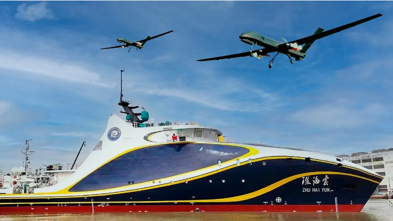 12 января 2023 года Китай спустил на воду первое крупное безэкипажное судно. Корабль «Чжу Хай Юнь» водоизмещением в 2 тыс. тонн, которое будет нести на себе целый парк разнообразных дронов — летательных, надводных и подводных, которые будут осуществлять мониторинг морской среды вблизи побережья Китая. Судно может совершать движение и выполнять различные операции по заранее запрограмированному заданию, с управлением исскуственным интеллектом. Допускается дистанционное управление оператором.