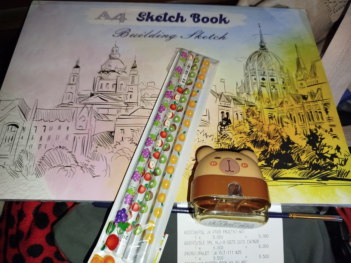 Решили купить новую форму для выпечки кекса. Но мы же так просто не можем за чем-то одним пойти. В среду написал знакомый, что в субботу (то есть сегодня) будет вести занятие по рисованию у старших школьников, пригласил присоединиться, сказал нести бумагу и карандаш. А я давно хотела завести скетчбук. Ну, и поехали мы с Амирой в книжный. Скетчбуки у нас дорогие, но я решила, что нам надо. В итоге помимо скетчбука на 50 листов купили набор из четырёх карандашей, точилку в виде капибары и тонкую кисточку. Я ещё купила очередную палитру Удовольствие обошлось в 45500 рупий (почти 230 рублей): Карандаши 25 рублей Точилка 30 рублей Палитра 47,50 рублей Кисточка 15 рублей Скетчбук 110 рублей Форму тоже купили - заехали на обратном пути в хозяйственный магазин 102,50 рублей такая, с крышкой, из плотного пластика. У меня из такого зайчики - к ним ничего не прилипает. Так что теперь будем рисовать скетчи, тонкие линии, точить капибарой карандаши и печь большие кексы.