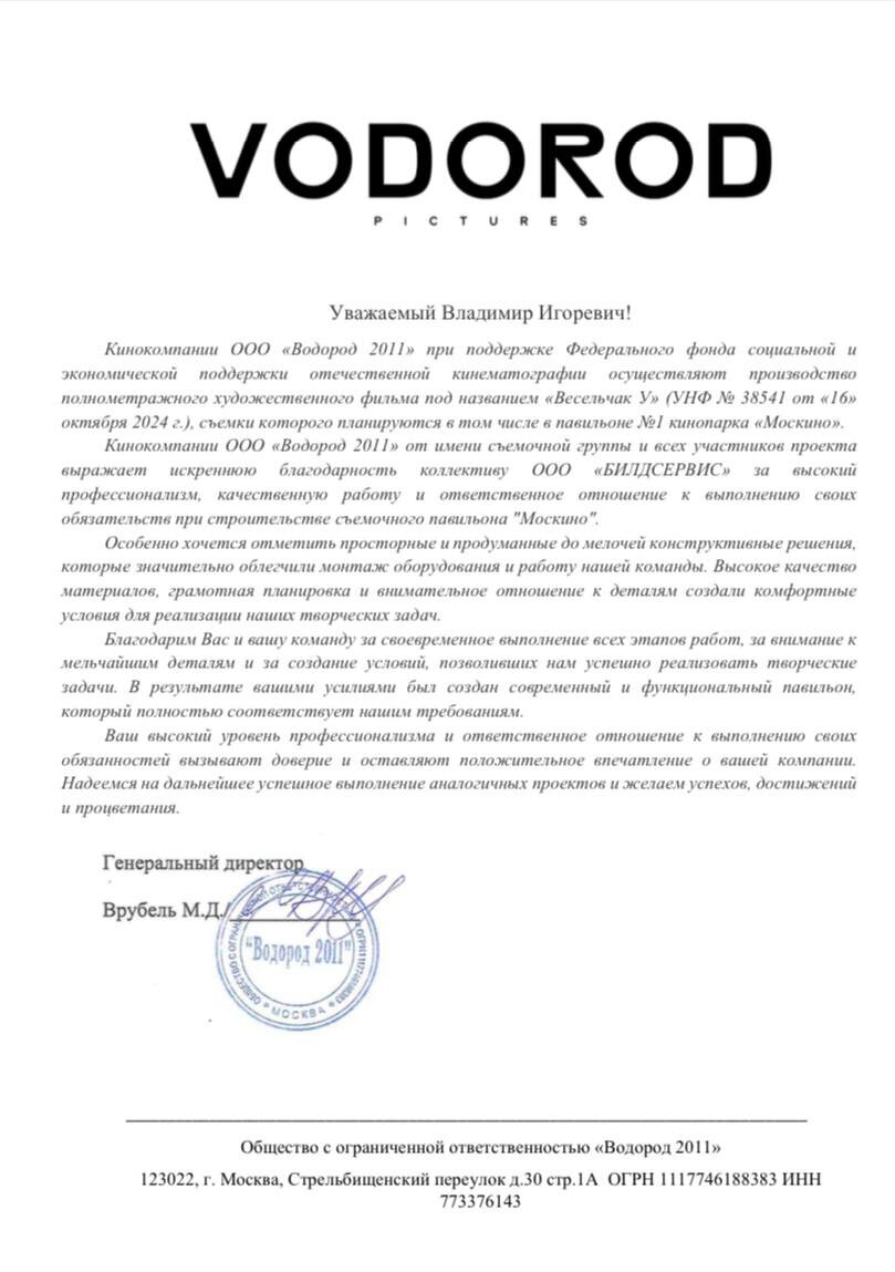 Компания «Водород 2011» выражает благодарность партнёрам! Кинокомпания ООО «Водород 2011», при поддержке Федерального фонда социальной и экономической поддержки отечественной кинематографии, готовит к производству полнометражный художественный фильм «Весельчак У». В рамках подготовки съёмок команда «Водород 2011» выражает искреннюю благодарность коллективу ООО «БИЛДСЕРВИС» за высокий профессионализм, качество работы и ответственное отношение к выполнению задач при строительстве съёмочного павильона «Москва». Особо отмечаются продуманные конструктивные решения, аккуратный монтаж оборудования и внимательное отношение к деталям — всё это создало комфортные условия для реализации творческих задач проекта. Благодаря слаженной работе и вниманию к мелочам был создан современный, функциональный павильон, который полностью соответствует требованиям съёмочной группы. Ваш профессионализм вызывает доверие и оставляет положительное впечатление. Желаем успехов, новых проектов и процветания! #М