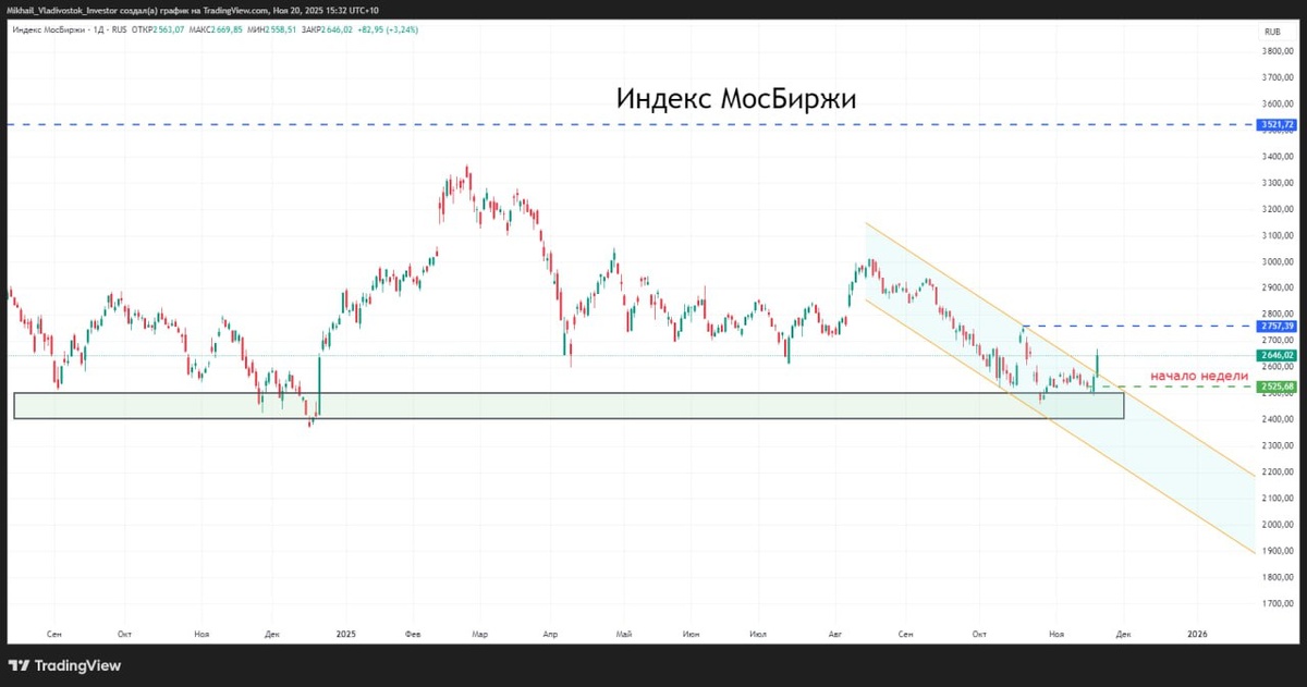 ОБЗОР РОССИЙСКОГО РЫНКА ЗА 19.11.2025 Подробный видео обзор тут👇 📺 https://youtu.be/kJ8MB1I7ZU0 😃 https://vkvideo.ru/video-226907663_456239277 Индекс МосБиржи +3,24% Индекс РТС +3,38% Доллар 80,95 руб. (Курс от Банка России) Евро 93,78 руб. (Курс от Банка России) Юань 11,29 руб. По графику: #imoex $MXZ5 Индекс МосБиржи продолжил рост после возобновления переговоров. Предложения США по окончанию конфликта на Украине включают в себя отказ Киева от некоторых территорий, а также — некоторых видов оружия. Условия мирного соглашения, разработанного США и Россией, должны были озвучить Зеленскому. Но позже сообщили, что они отвергли позиции США. Короче метание бумеранга продолжается. На РФ пытаются надавить санкциями, а Украину коррупционными скандалами. Инфляция недельная немного ускорилась, а годовая замедлилась. Но это мало сейчас кого интересует по факту. Сегодня у нас куча отчетов и старт торгов акциями ДОМ.РФ $DOMRF тикер. Очень интересно конечно будет понаблюдать за торгами. Осо