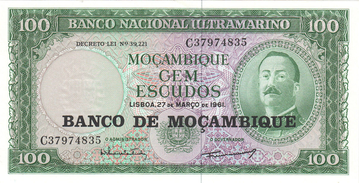В 1975 Мозамбик получил зависимость от Португалии. Власти республики приняли в качестве денежной единицы метикал (вместо эскудо, который был ранее). Тем не менее, монеты и банкноты новой валюты не выпускались до 1980 г. Во второй половине 70-х гг., чтобы сделать более видимые политические изменения в стране, на старых банкнотах номиналом 50, 100, 500 и 1 тыс. эскудо, выпущенные ранее Национальным заморским банком Португалии, были сделаны надпечатки с названием центрального банка нового государства - Банк Мозамбика. Банкнота выпущена 27 марта 1961 г. и надпечатана в 1976 г., при этом она оставалась в обращении до 1980 г. Размер: 166×85 мм. Основной цвет банкноты - зеленый и фиолетовый. В качестве защитных средств используется защитная нить и водяной знак в виде герба португальской заморской провинции Мозамбик. На лицевой стороне, окаймленной тонкой белой полосой без печати, расположена декоративная рамка, которая по вертикали украшена растительным и цветочным орнаментом. В четырех угла