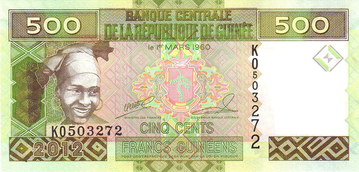 Один гвинейский франк состоит из 100 сантимов. На языке народа манинка, распространённом в Гвинее, один гвинейский франк называется словом «даласи», которое первоначально означало сначала пять французских франков. Графический дизайн данной банкноты повторяет тот, что используется с 2006 г. Но, при этом изменились размеры - купюры этого выпуска меньше предыдущих. Размер: 128×63 мм. Банкнота оформлена в ярко-зеленом цвете. В качестве защитных элементов водяной знак девушки в головном уборе, защитная нить и электротип. На лицевой стороне слева изображен портрет местной девушки в традиционном головном уборе из ткани. Над ней, в левом верхнем углу, обозначен цифрами номинал "500", который повторяется в противоположном верхнем правом углу. Сверху по центру находится название банка-эмитента (Banque Centrale de la Republique de Guinee — Центральный банк Гвинейской Республики) и под ней на французском языке написана дата введения гвинейского франка (1 марта 1960 года). В центре банкноты располо