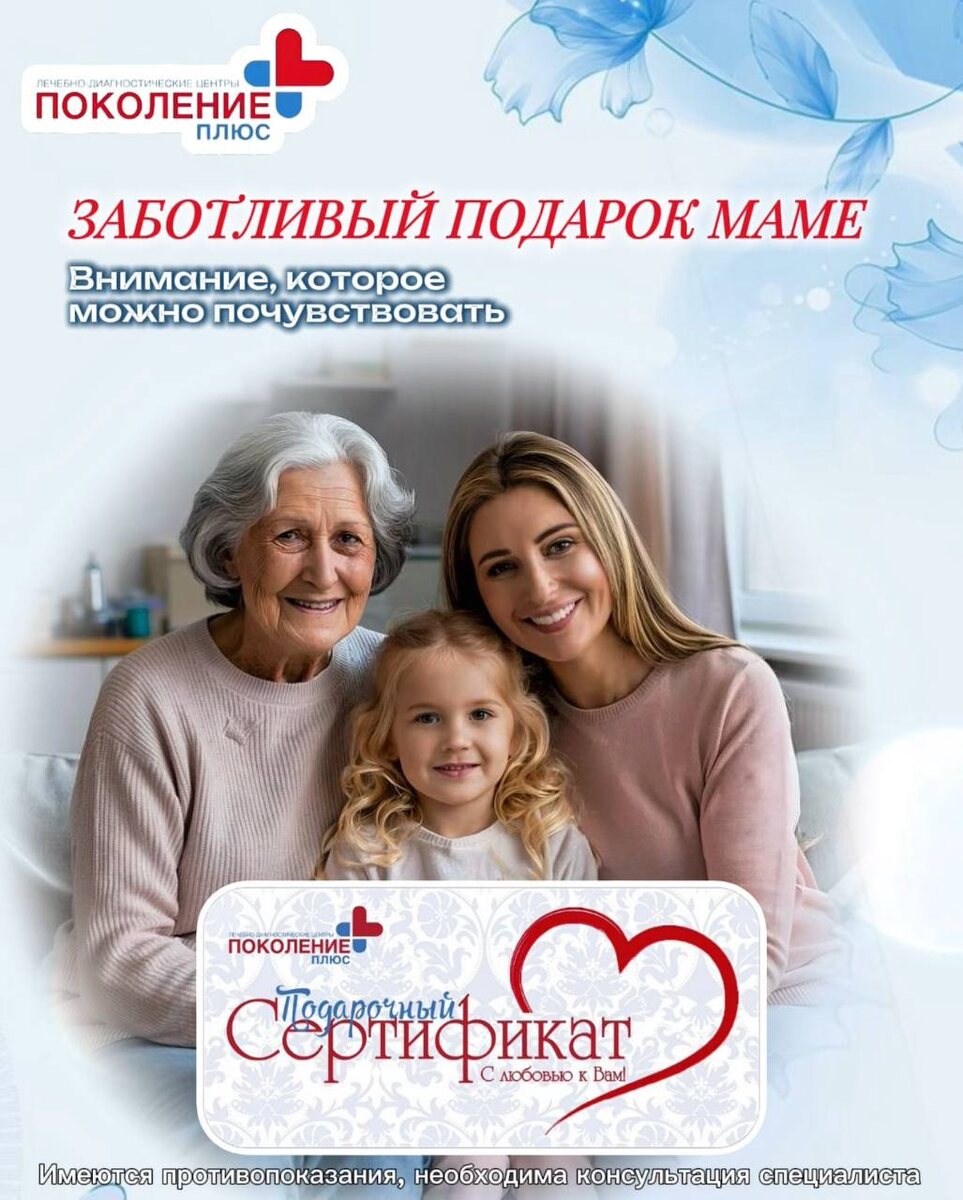 Дарим заботу вместе! Скоро День матери 🌸 В этот день хочется сказать маме больше теплых слов и провести больше времени вместе 🤰 А лучший подарок — не просто внимание, а забота, которую можно почувствовать. Сеть клиник «Поколение плюс» подготовила готовое решение для подарка 💝— сертификат на любую сумму, который мама сможет использовать для консультации доктора или медицинской процедуры. 👩🦱👱♀👵🤰Пусть ваши мамы будут здоровы! Заказать сертификат и задать вопросы можно: 📌через телеграм vk.cc/cMb4Qt 📌 через WhatsApp по номеру +7(930)780-50-03. ✔️Имеются противопоказания. Необходимо проконсультироваться со специалистом. #поколение_оважном