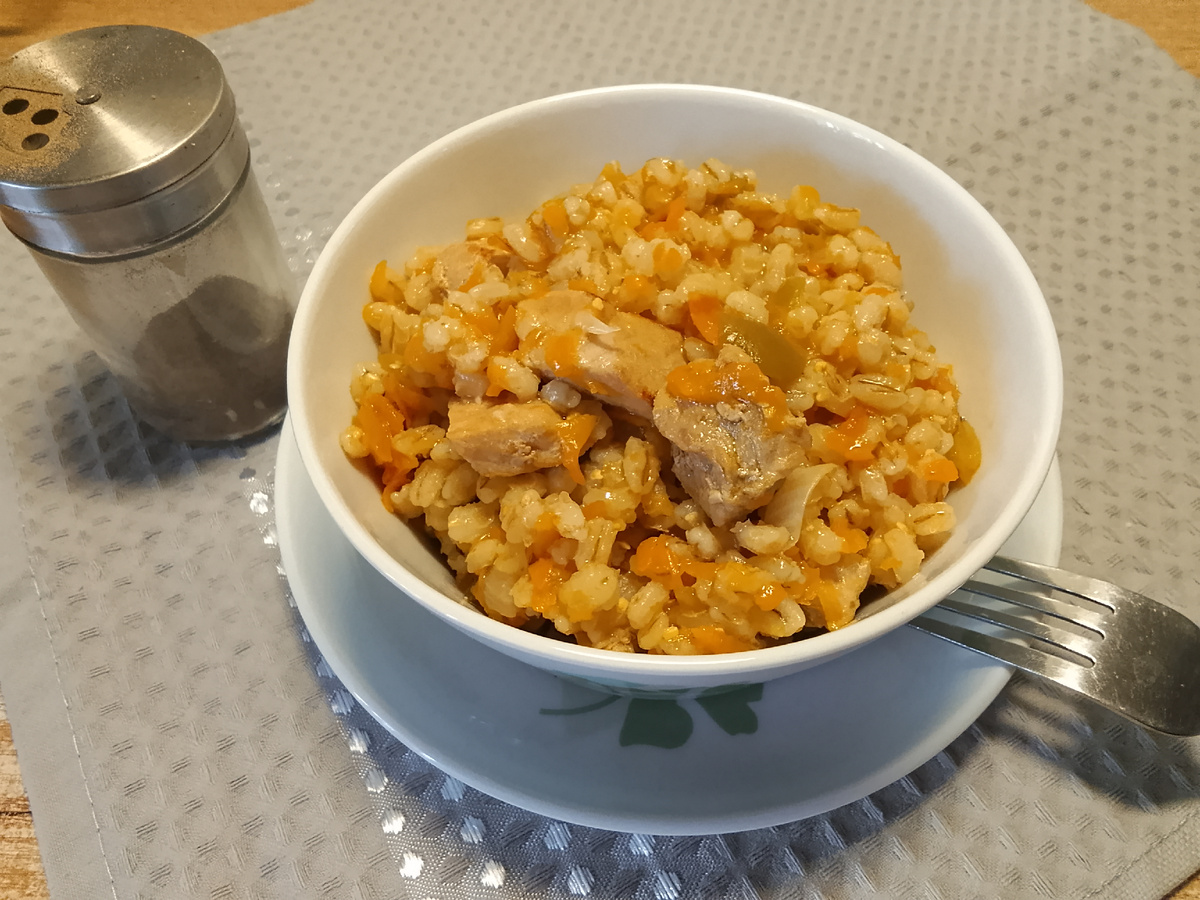 Мужчины, которые служили в армии СССР, перловую кашу называют "кирзой" и есть ее почти всегда отказываются. Но если приготовить кашу с мясом и овощами, получается очень вкусно и сытно. Мой муж в первые годы нашей совместной жизни кашу есть не хотел, но потом распробовал и ел уже у удовольствием. Сейчас кашу едят и дети и внуки. Что бы каша была действительно вкусной, крупы, в сухом виде, и мяса должно быть одинаковое количество. Овощей, так же, должно быть довольно много. Перловку переберите и залейте холодной водой на 3-4 часа. Можно оставить на ночь. На мультиварке выставьте программу "мультиповар" 90* на 2 часа. Выложите в чашу свиной жир и растопите его. Мясо нарежьте не большими кубиками и выложите в чашу. Обжаривайте мясо 15-20 минут помешивая. Лук, сладкий перец и помидор нарежьте не большими кусочками и добавьте к мясу. Добавьте в чашу натертую на крупной терке морковь. У меня морковь замороженная. Помешивая обжарьте овощи до мягкости овощей. С крупы слейте воду. Перловку еще