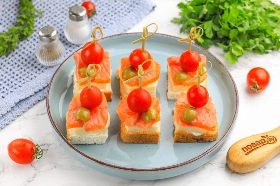 "Резкими движениями нарежем рыбу на аккуратные кусочки, чтобы украсить и придать блюду изысканный вид." - Соберите канапе: положите кусочек рыбы сверху на сыр. Украсьте веточкой укропа и сбрызните лимонным соком.