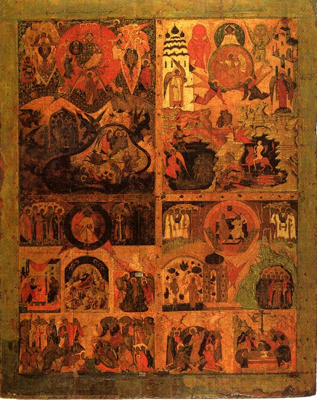 - «Во гробе плотски, во аде же с душею яко Бог...» (Нижняя правая часть). Сюжет, основанный на пасхальном каноне, изображает победу Христа над смертью. Он показывает, что, находясь телом во гробе, душой Христос сошел в ад, чтобы разрушить его врата, освободить праведников и даровать всему человечеству надежду на воскресение.
